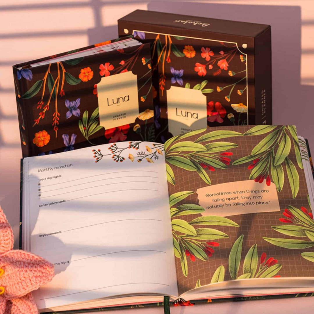 LUNA undated planner comes in a sturdy floral-themed gift box with complimentary accessories — including :